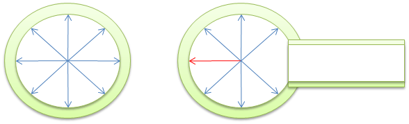 Figure 6. Symmetric- and A-symmetric loading of the pipe cross-section. Force cancels in the symmetric condition, shown as blue force arrows, while a net reaction force, shown as a red force arrow, is created in the a-symmetric condition. The larger this net reaction force, the larger the unbalanced area and the stronger the pulsation. (Click on figure to expand)